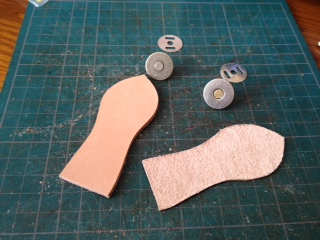まずは、ベロの内側になる薄い革にマグネットの凸を取り付けます。