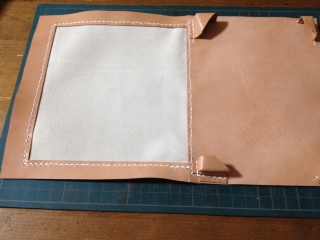 次に、スエード革の枠部分を縫いつけるために